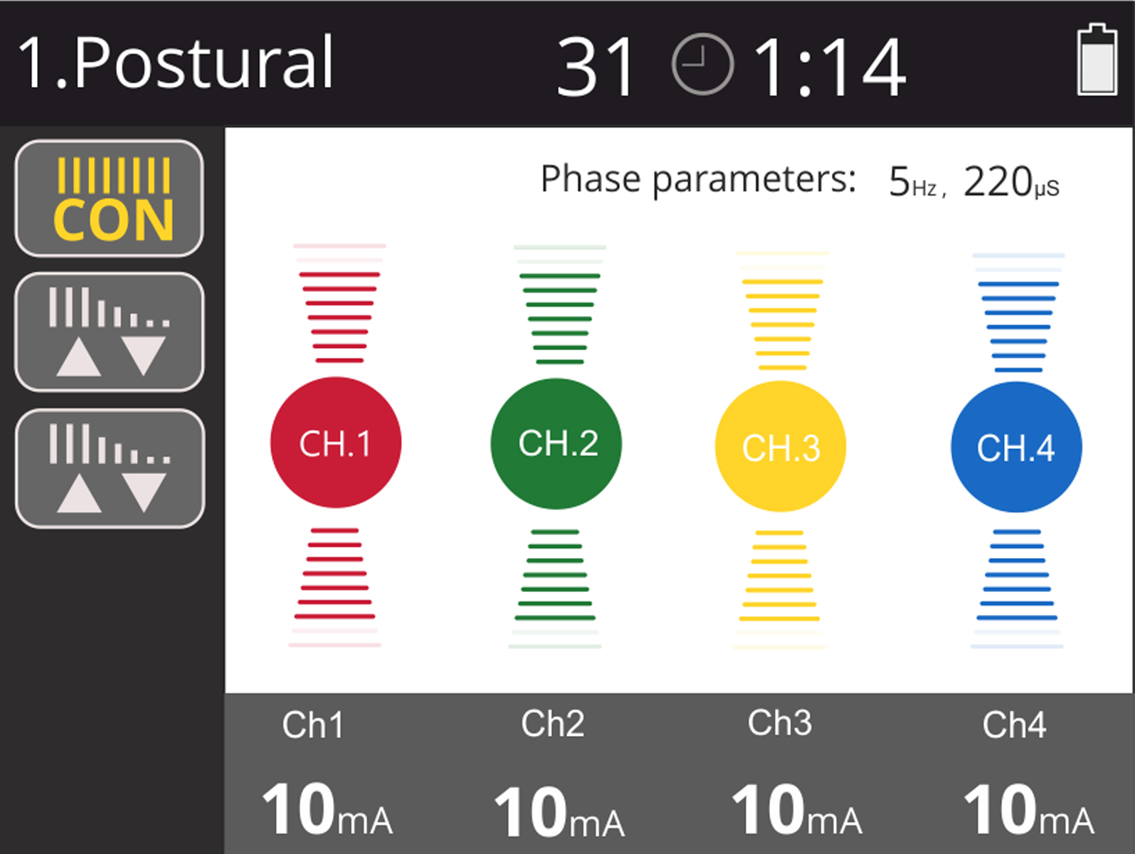 - EMG Biofeedback between stimulation (muscle activity and tiredness indication when using muscle stimulation).